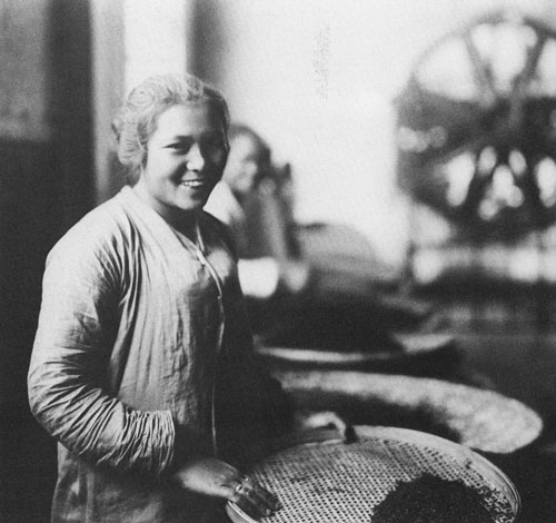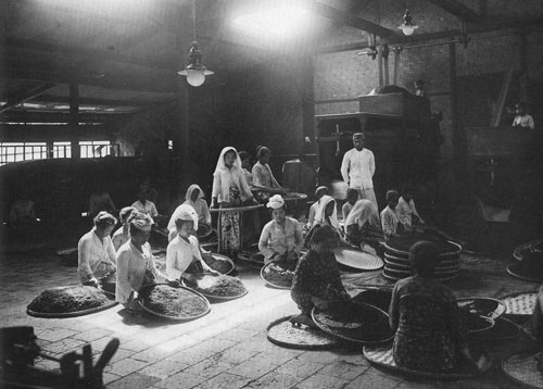 | #162: After the drying process the tea is sorted by sorters. The photo shows the interior of the Tjikadjang enterprise near Garoet. |