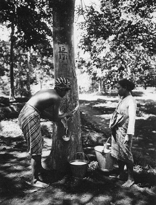 | #168: The tapping of rubber (latex) by slicing the bark. Here a slice is made in a V-form, an old tapping method. |