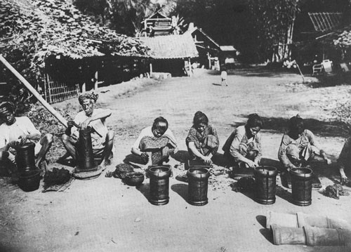 The lodong is hung under the opening of the kawoeng flower stalk to catch the dripping fluid. After a cooking process and steaming the brown goela arèn is made from lahang. |