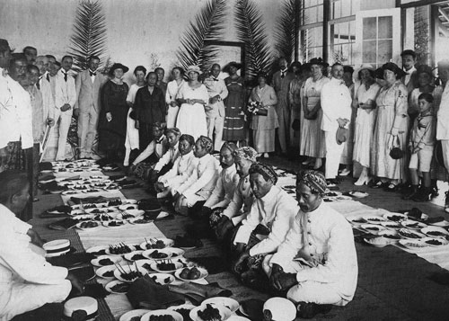 | #190: The ceremonial festive meal at the inauguration of the Garoet Provincial Hospital in March 1922, at which senior and junior Dutch and indigenous administrative officers were present. Sister Hulshoff stands to the left of centre next to the lady with the dark hat. |